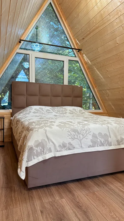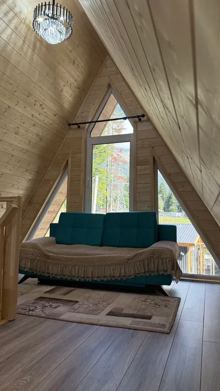 На втором этаже двуспальная кровать и двуспальный диван с прекрасным видом.