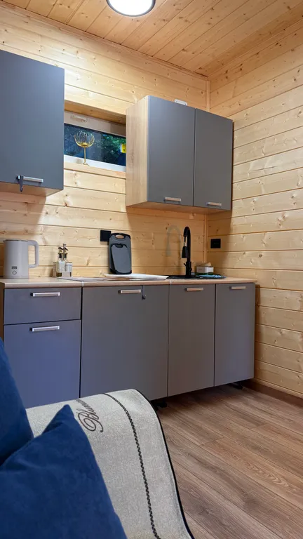 На первом этаже: кухонный гарнитур, холодильник, чайник, варочная панель, микроволновая печь, стол, стулья, телевизор, двуспальный диван.