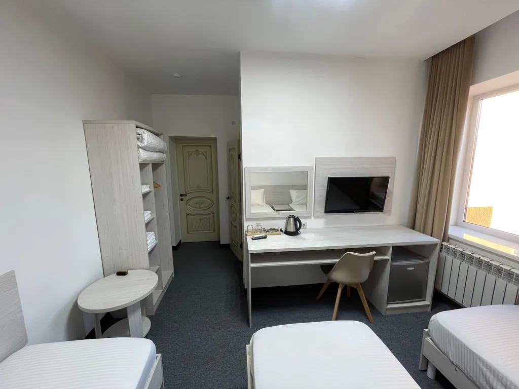Пространство номера организовано с максимальной эргономичностью. Вам доступен вместительный шкаф для размещения одежды и багажа, чтобы вы могли поддерживать порядок. Для тех, кто совмещает отдых с работой, предусмотрен удобный рабочий стол с креслом – идеальное место для сосредоточенной деятельности.Телевизор с широким выбором каналов позволит вам расслабиться и насладиться любимыми программами после насыщенного дня.