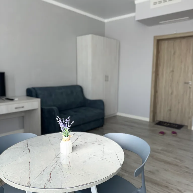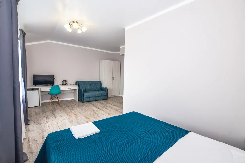 В каждом номере: большая кровать, раскладной диван, прикроватные тумбочки, шкаф, ванная комната с душевой кабиной, рабочее место (стол), телевизор, система климат-контроля, чайник, приборы для приготовления чая или кофе, стол обеденный и стулья.