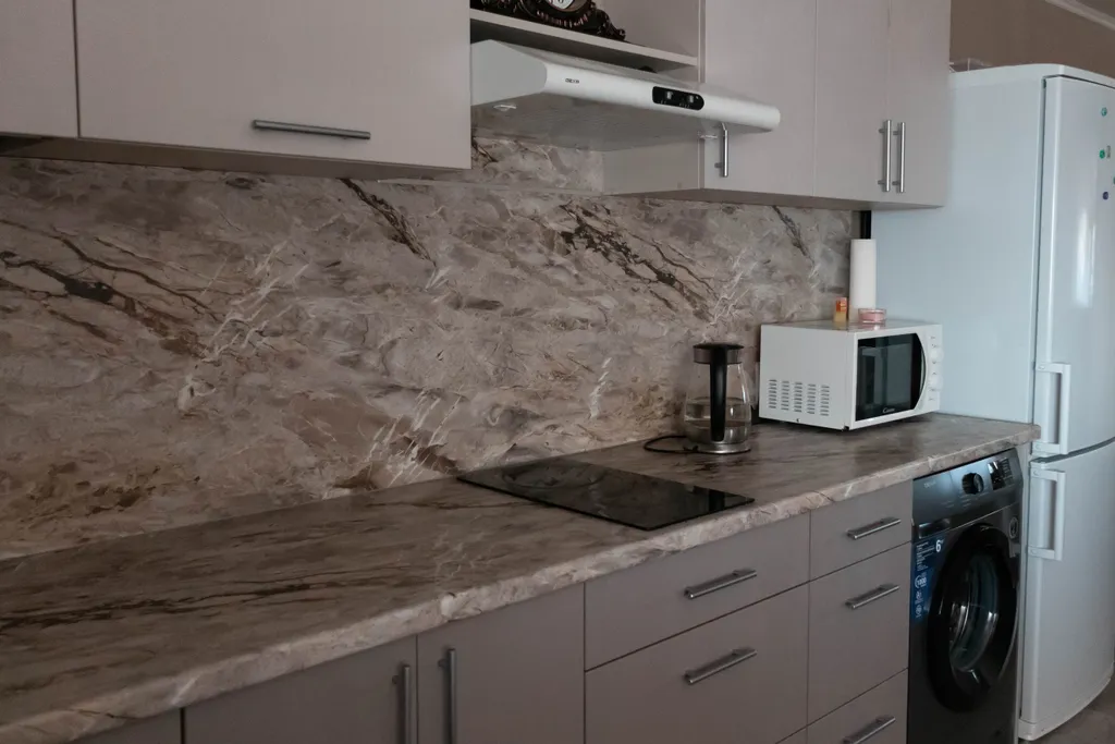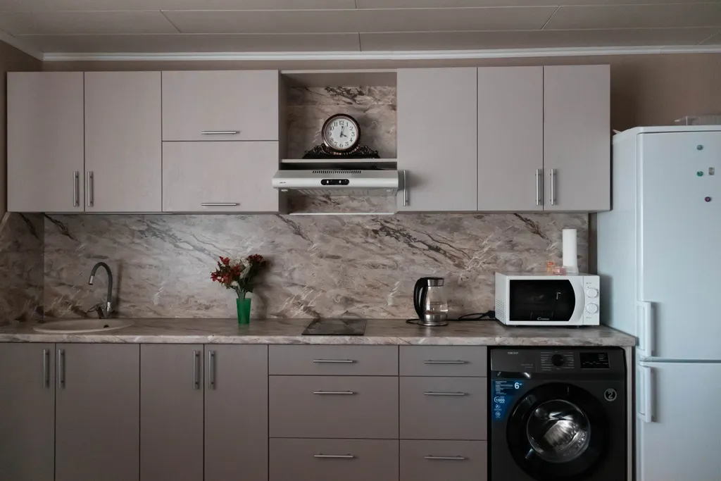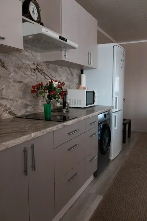 - Современная бытовая техника: керамическая плита, холодильник, микроволновая печь, чайник (вся необходимая посуда),