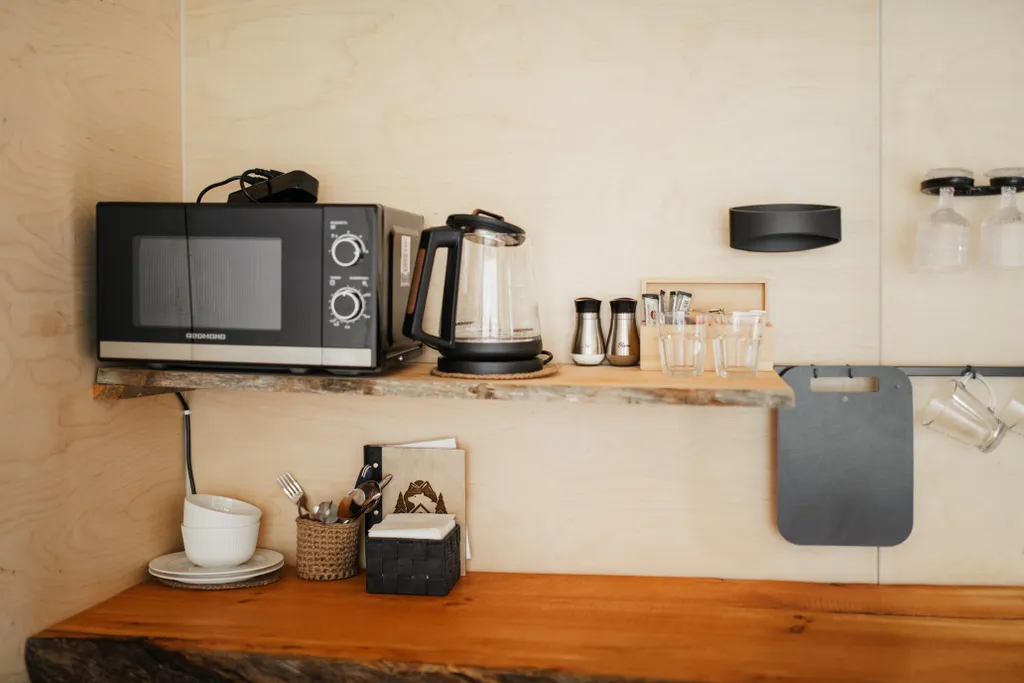 Мини-кухня с холодильником, микроволновой печью, чайником и посудой.