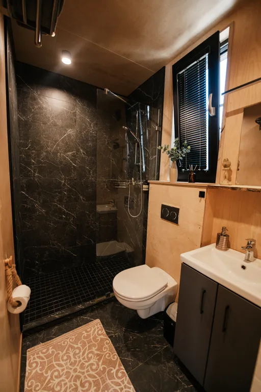 Удобный санузел с полноценным душем, комплекты полотенец и косметические наборы (шампунь, гель для душа), фен.