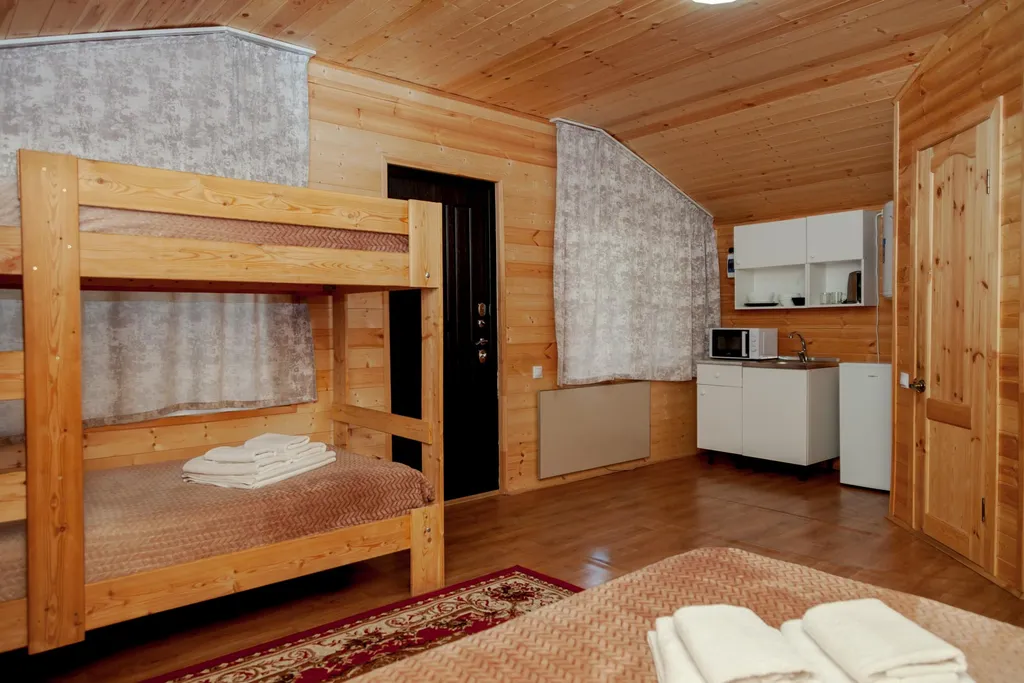 - Спальни: 4 спальных мест, включая двуспальную и двухэтажную кровати, гарантируют комфортный сон каждому гостю.