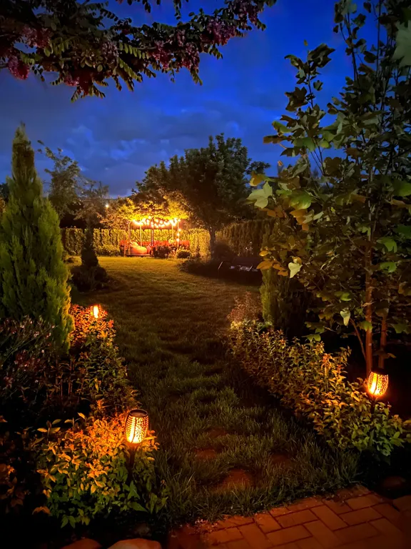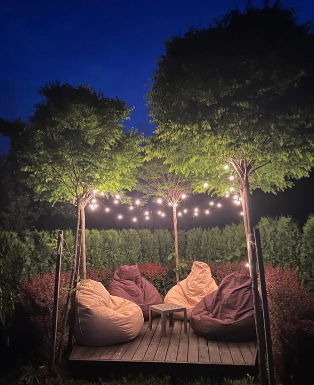 Зона под акациями для утреннего кофе или ночных бесед.