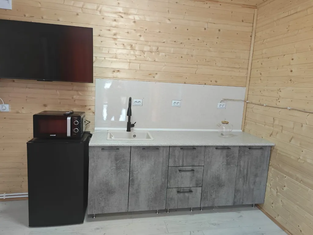 холодильник ,микроволновая печь ,,посуда ,принадлежности для приготовления ,стол ,стулья, диван, телевизор ,WiFi.