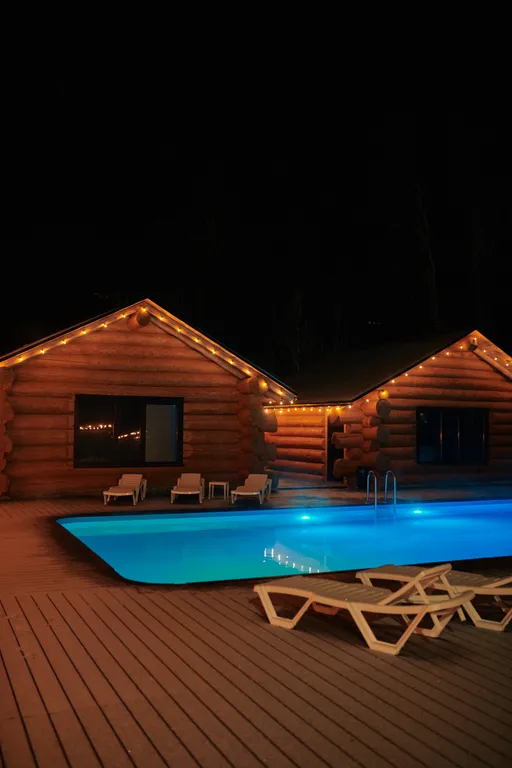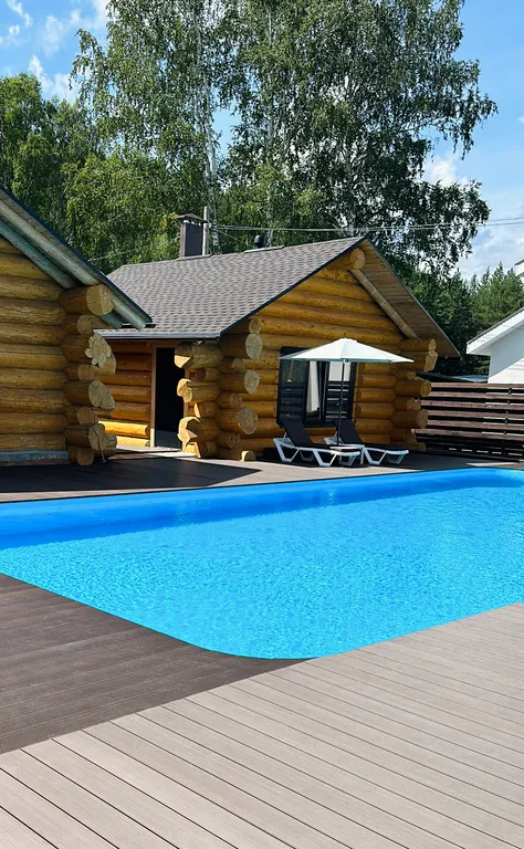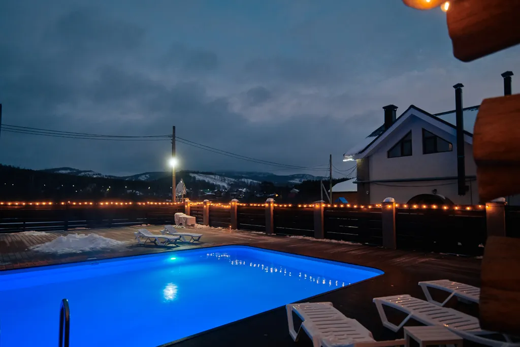 Внимание! Бассейн расположен в 200 м от коттеджей. На территории бассейна имеются баня, хаммам (бронируются отдельно) и раздевалки. Температура воды в бассейне зимой 35 градусов. Посещение бассейна включено в стоимость проживания и вы сможете плавать в нём в любое время!