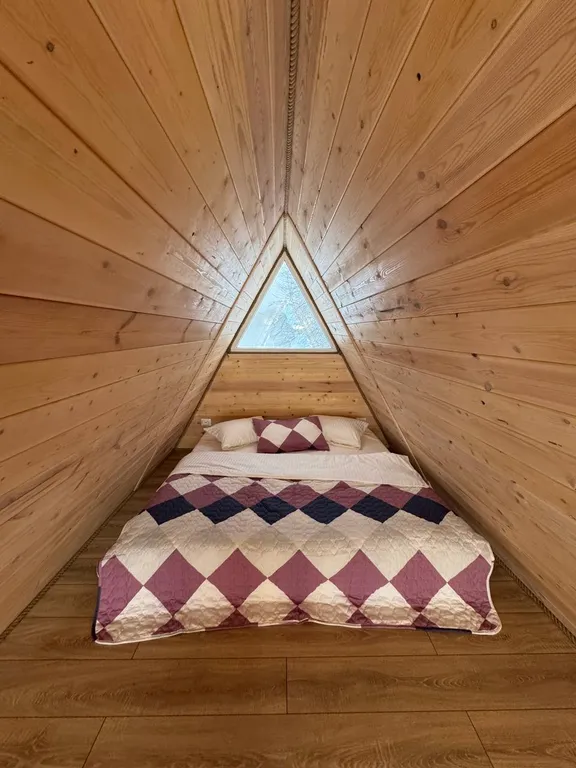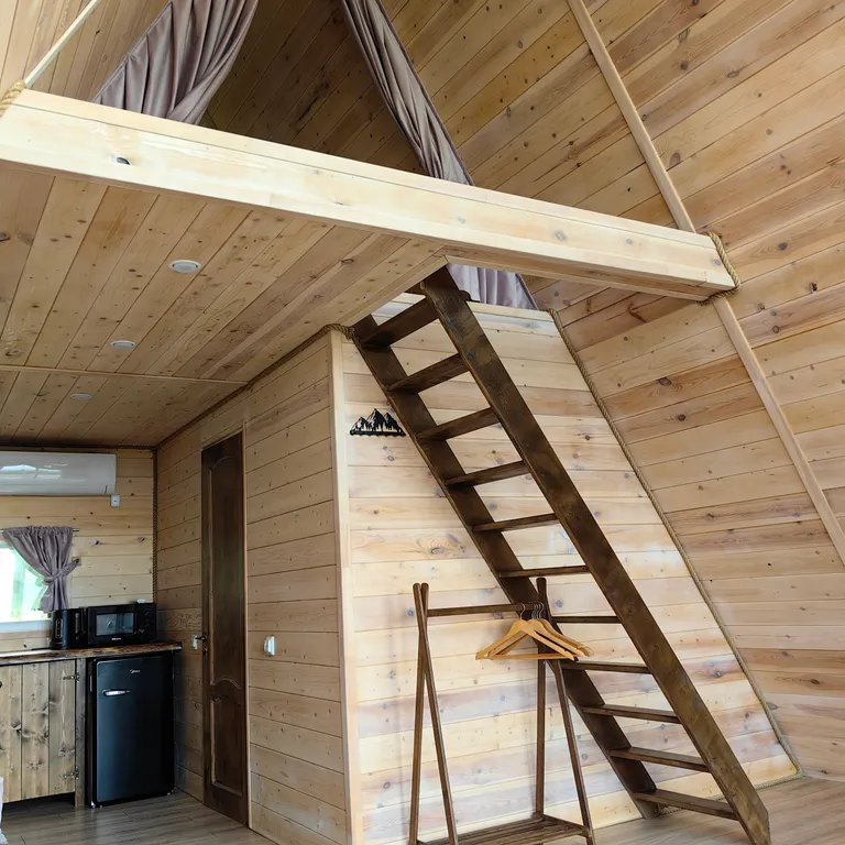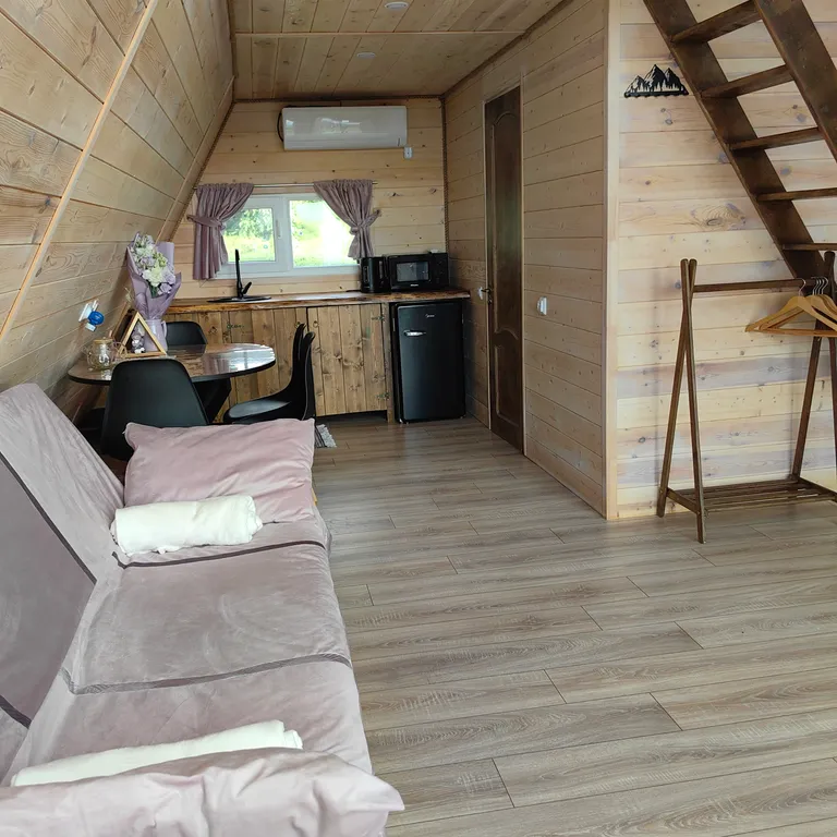 - Спальня на мансарде с двуспальным матрасом (без дверей), на первом этаже раскладывающийся диван в общей комнате.