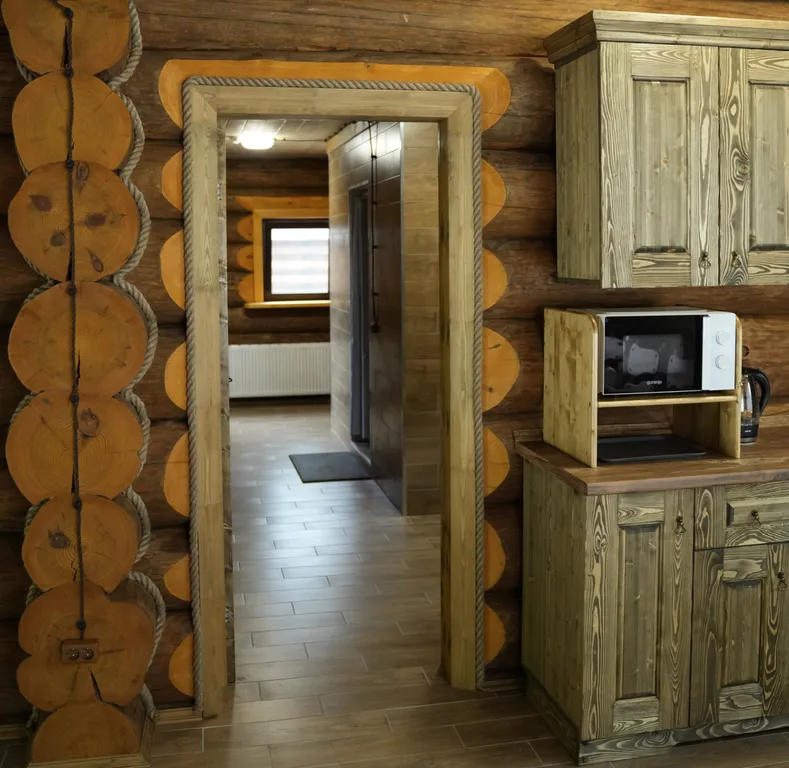 Гостиная, совмещенная с обеденной зоной. Большой обеденный стол со стульями, небольшая кухня оборудованная холодильником, микроволновой печью, посудомоечной машиной, а также всей необходимой посудой. Телевизор.
