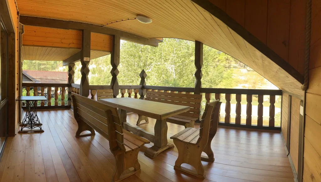 Большая лоджия с видом на реку. Большой стол, 2 лавки, 2 стула.