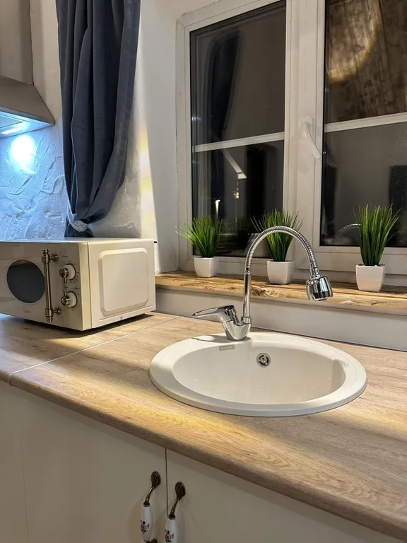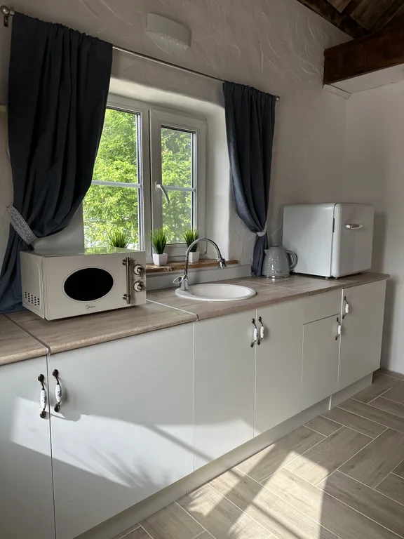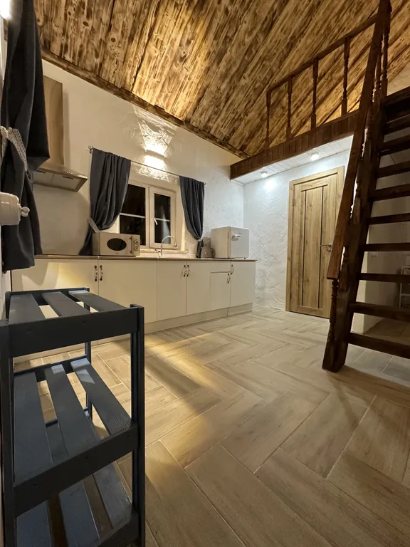 - Гостиная с теплым полом, оснащенная всем необходимым для готовки и сервировки