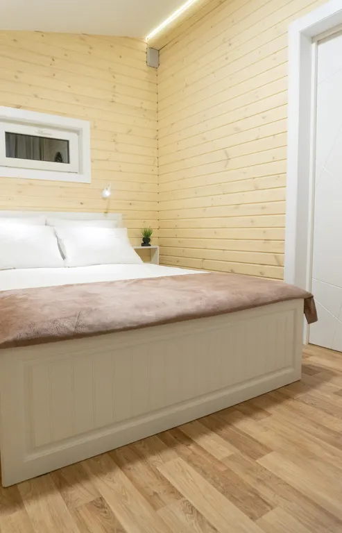 Всего в доме 4 спальных места диван-кровать на 2 человек в гостиной и двуспальная кровать в спальне. Имеется совмещенный с душем санузел.