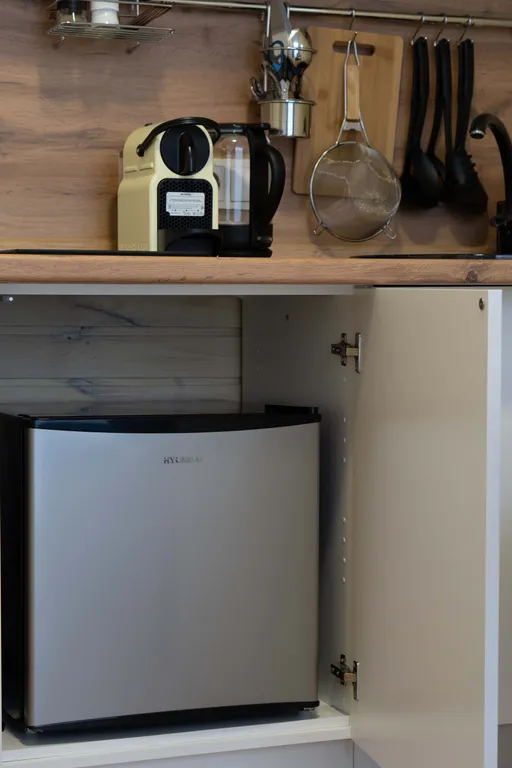 Укомплектованная кухня - холодильник, чайник, кофемашина и прочая необходимая кухонная утварь. Имеется утюг и гладильная доска, кондиционер, TV, Wi-Fi, на общей территории имеется стиральная машина в доступе 24/7.