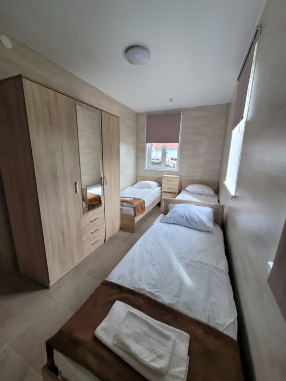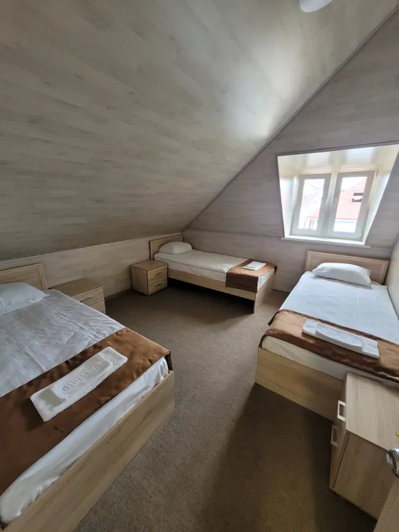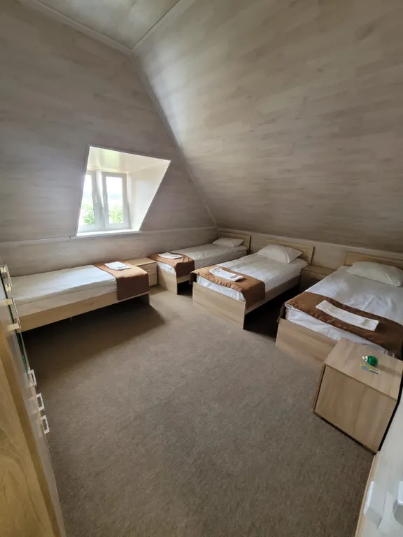 Первый этаж: большая гостиная, кухня - столовая, четыре спальни с односпальными кроватями (1 кровать, 2 кровати, 3 кровати и 3 кровати), два санузла, душ;