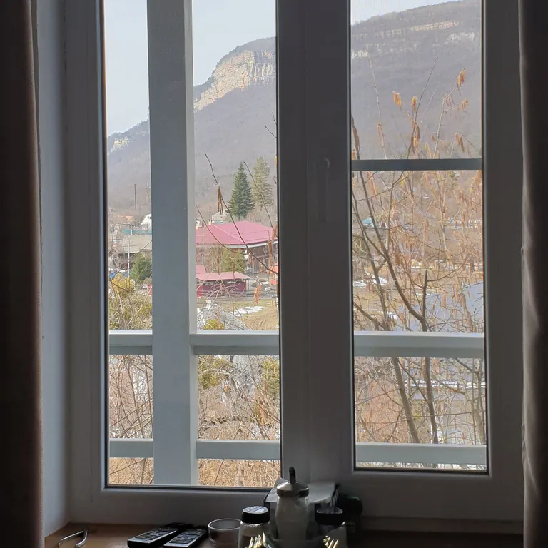 Большая открытая веранда под крышей, со столом и стульями. Роскошный вид, в том числе на Орлиную полочку. Перед домом - большая поляна с местом для общего костра и лавками.