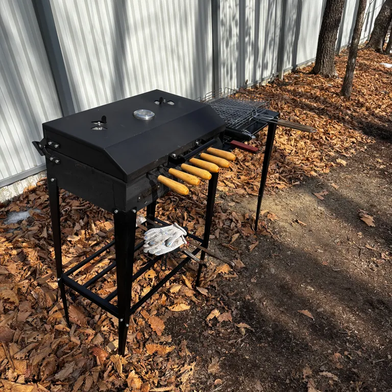 Мангальная и костровая зоны. Два вида решёток, щипцы, решётка для сосисок, шампуры.