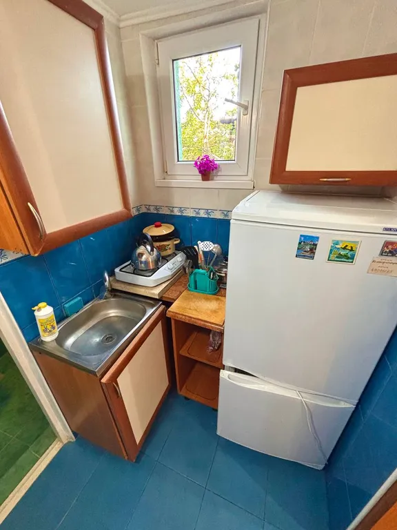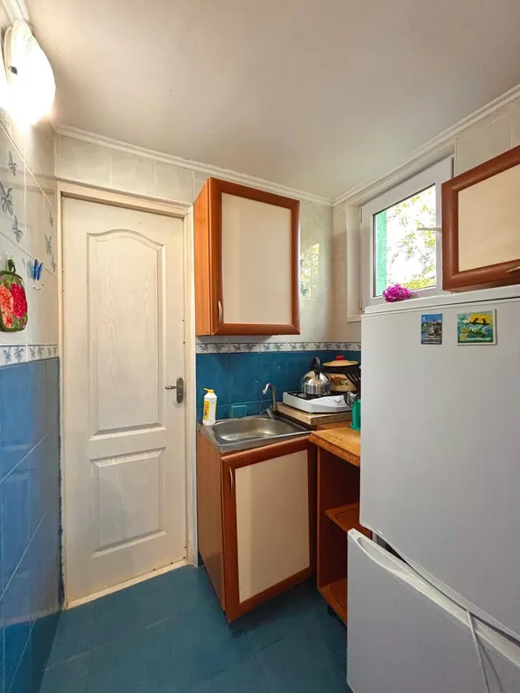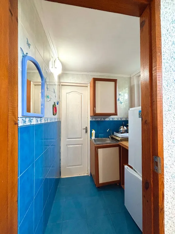Номер состоит из комнаты, кухни, санузла. В комнате широкая кровать с новым ортопедическим матрасом, раскладывающий диван-малютка, шкаф, стол, стулья, тумбочка.