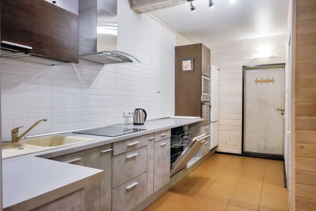 Кухня полностью укомплектована посудой и бытовой техникой.