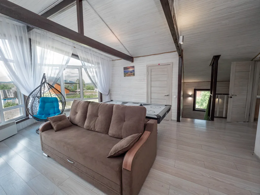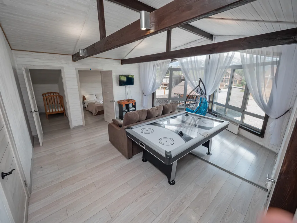 - 2 гостиные (1 и 2 этаж) с раскладными диванами, TV, аэрохоккеем, Xbox, настольными играми, колонкой и светомузыкой.