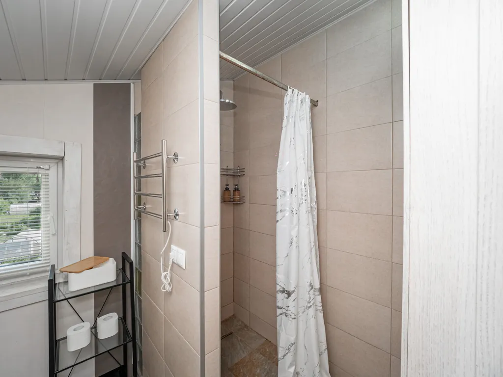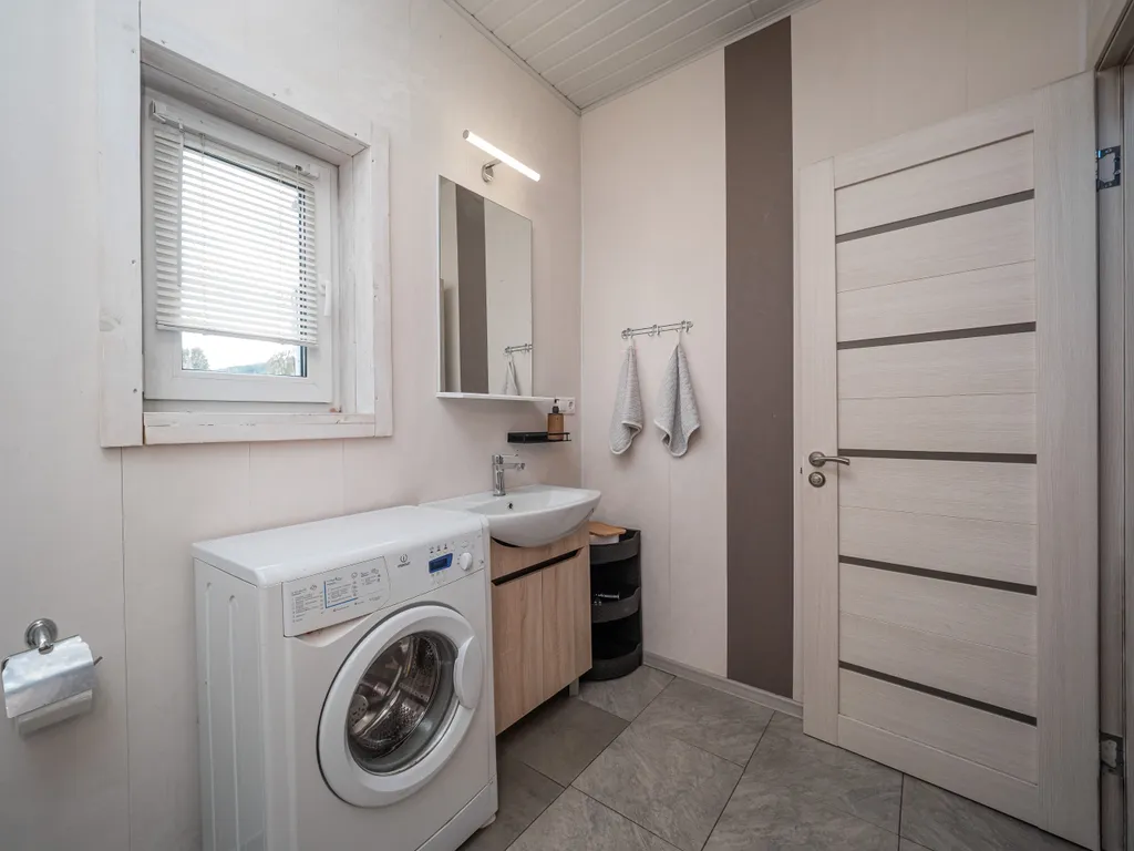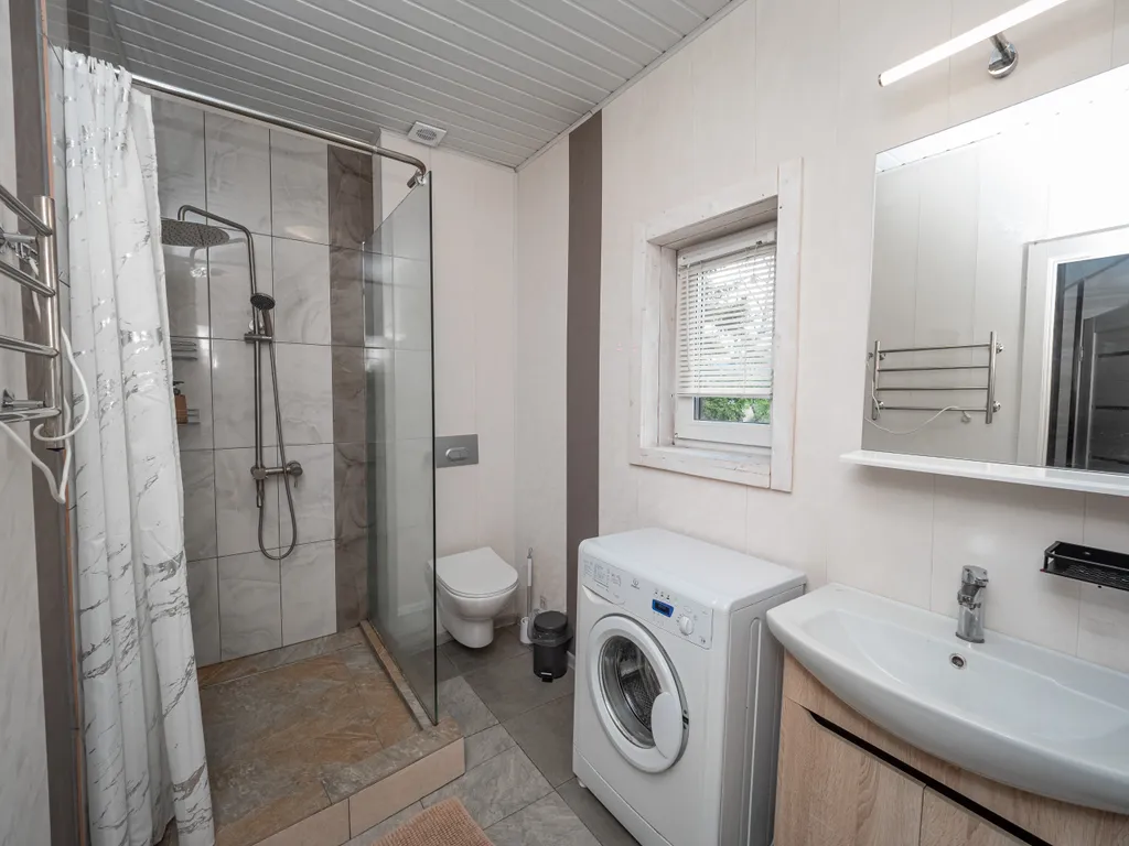 - 2 санузла с душевыми кабинами, стиральной машиной, полотенцами, феном, гелем для душа, шампунем и мылом.
