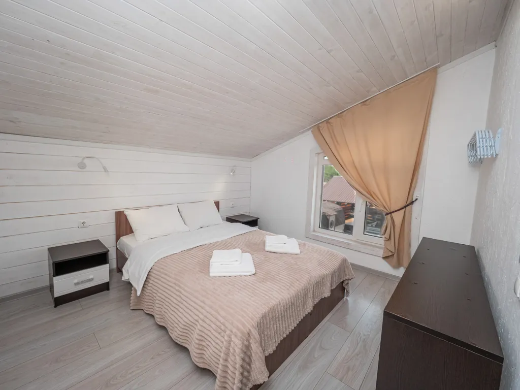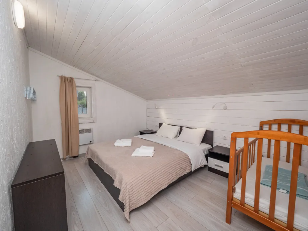 - 6 спален: 2 на первом этаже (двуспальная и 2 односпальные кровати, которые можно сдвинуть), 4 на втором (все двуспальные), детская кроватка.