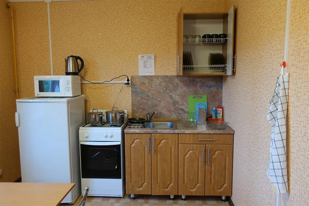 Кухня светлая, хорошо оснащена. Есть посуда для приготовления пищи, микроволновая печь, холодильник, чайник. Большой стол удобен как для семейного обеда, так и для детских занятий.