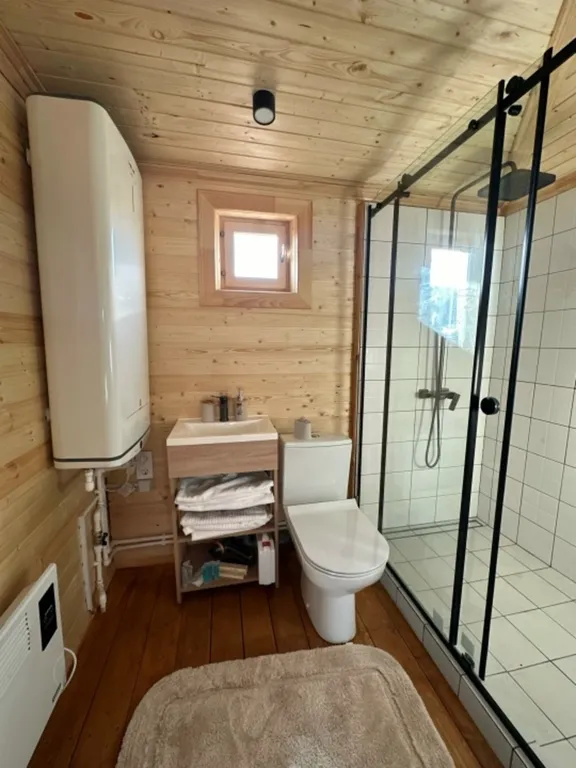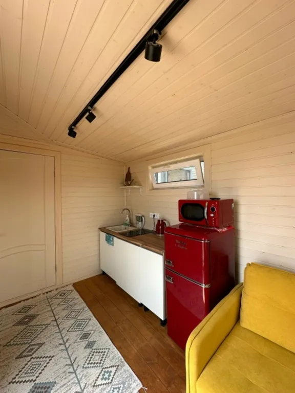 В доме двухспальная кровать с ортопедическим матрасом. Ванная комната с душевой кабиной, унитазом и раковиной, также вы сможете воспользоваться бесплатно гигиеническими принадлежностями и феном. Мини-кухня с необходимой техникой: плитой, холодильником, микроволновкой и местом для хранения посуды.