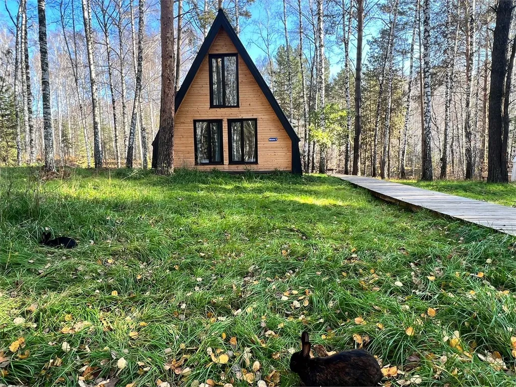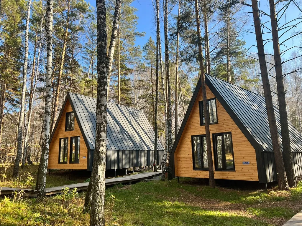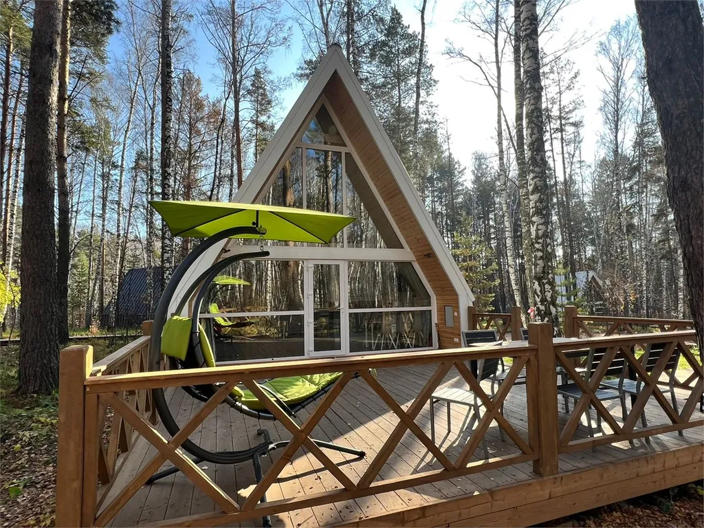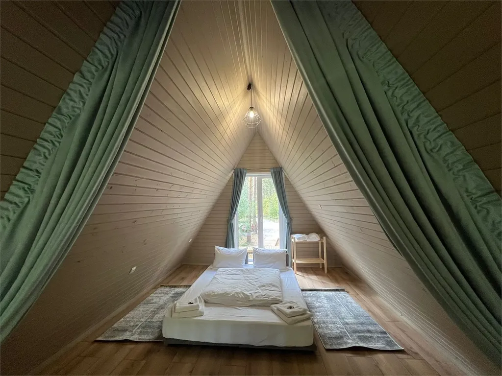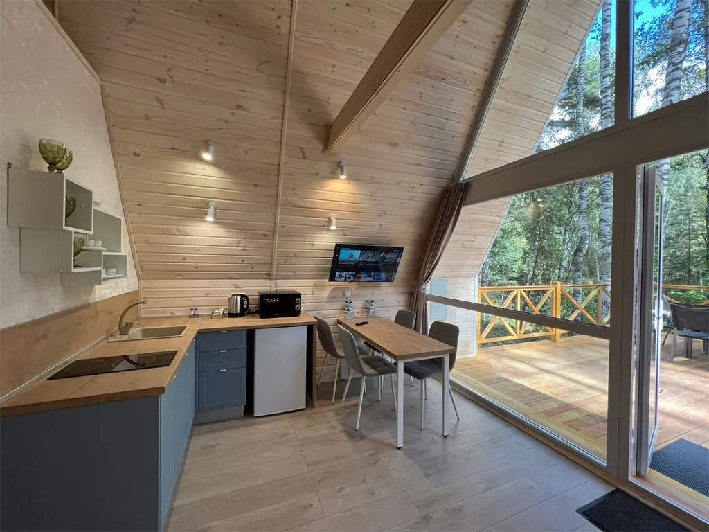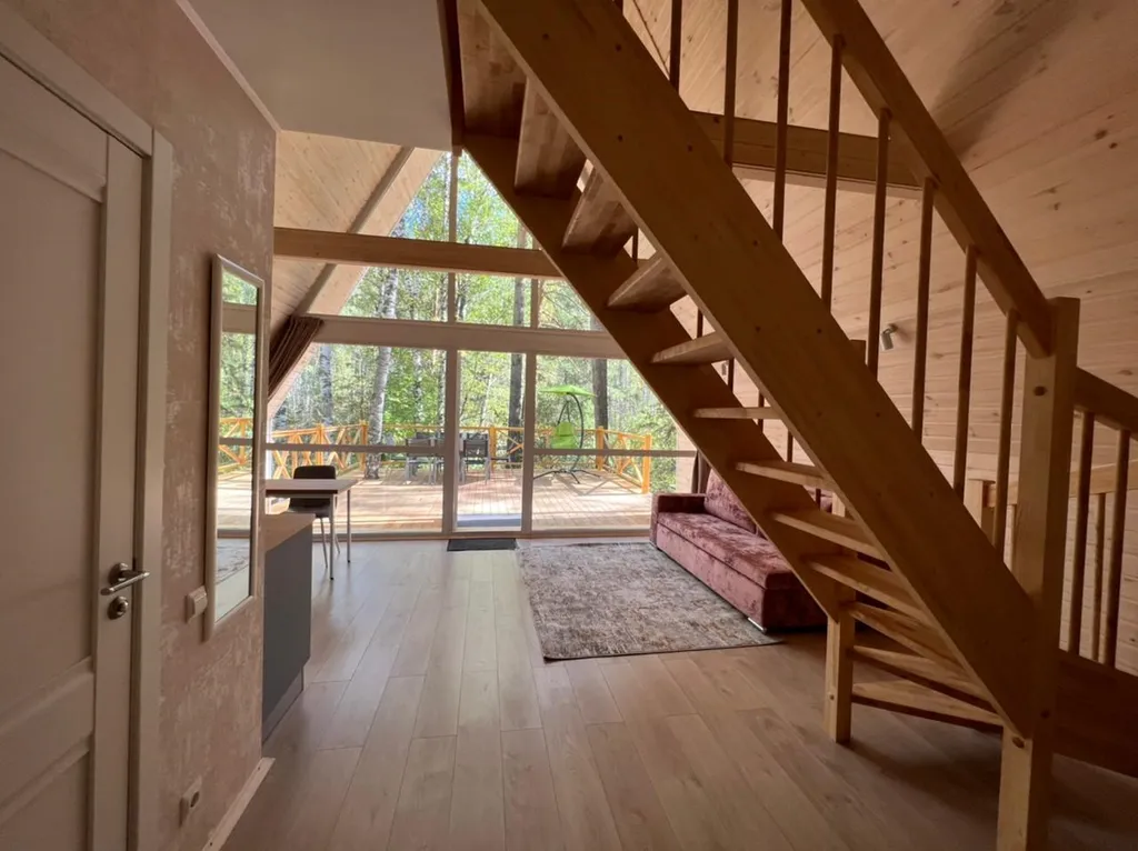 В спальнях двуспальные кровати и полки для хранения вещей. Большая терраса с мебелью и видом на лес.