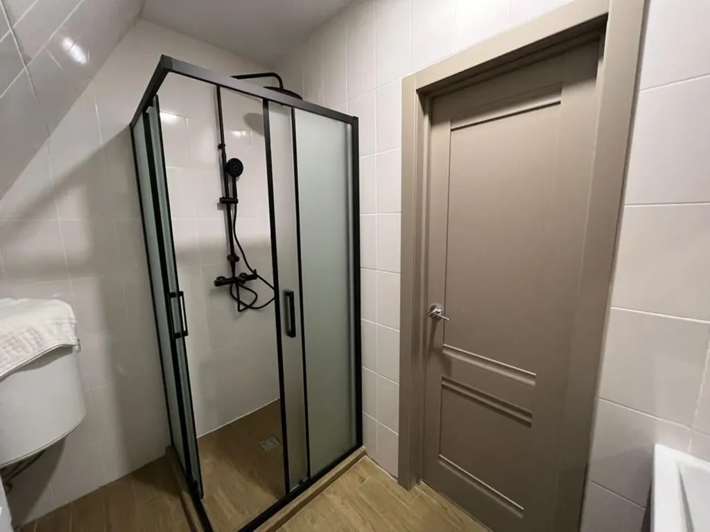 Санузел с душевой кабиной и всеми необходимыми принадлежностями (фен, зубной набор, гель для душа, шампунь, халаты, тапочки).