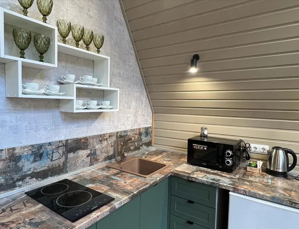 В кухне-гостиной обеденная зона, шкаф, раскладной диван, телевизор, холодильник, чайник, кухонные принадлежности, варочная панель, микроволновая печь, раковина, кондиционер.