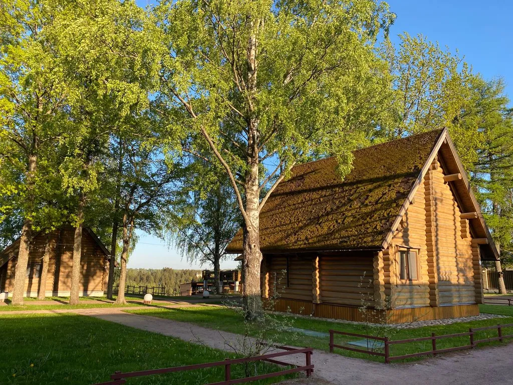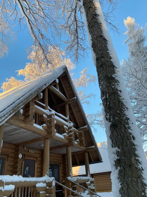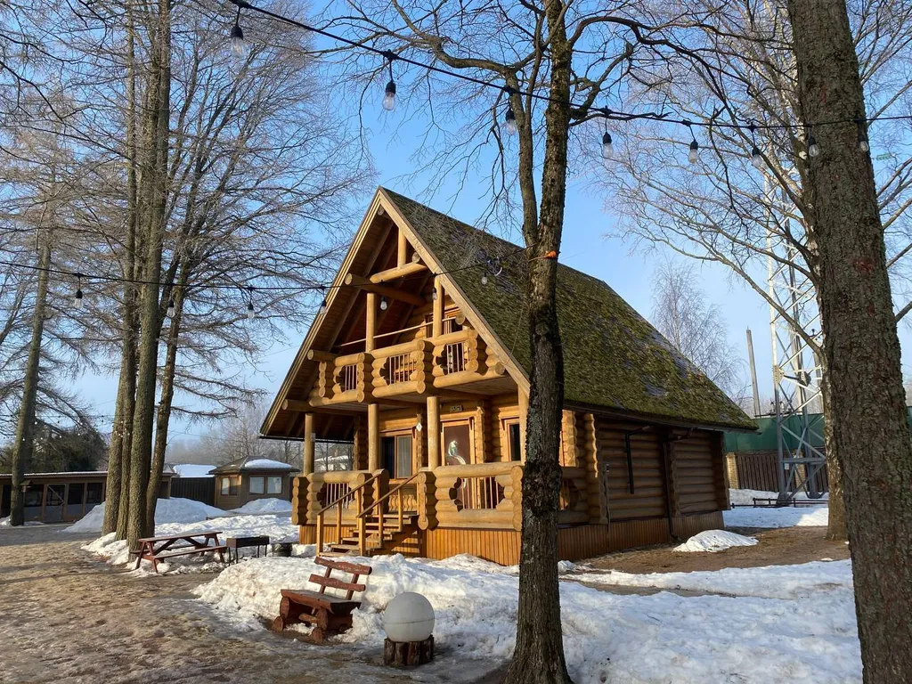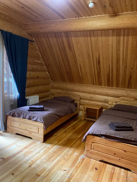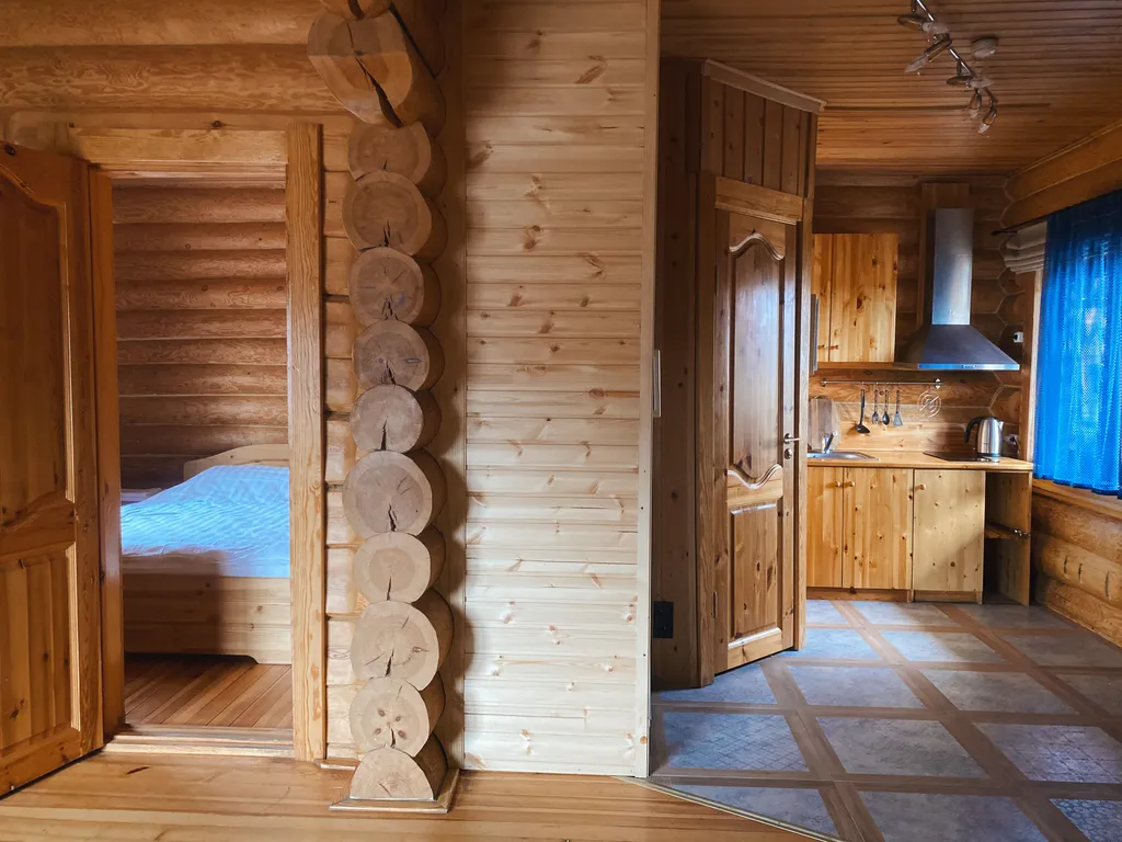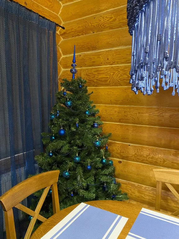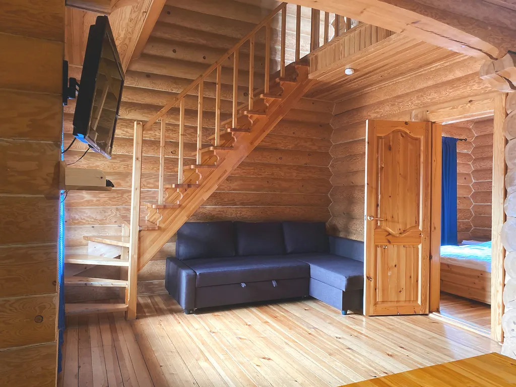 Внутри дома на первом этаже расположены: входная зона с гардеробом, кухня со всей необходимой посудой, обеденная зона, объединённая с зоной отдыха с раскладывающимся двуспальным диваном, спальня с двуспальной кроватью и санузел с душевой. На втором этаже располагаются: пространство второго света и спальня с двумя односпальными кроватями, откуда можно выйти на балкон. Интерьер домика выполнен в синих тонах. Из техники в домике есть: холодильник, плита, чайник, микроволновка, телевизор и фен. У домика есть мангальная зона.