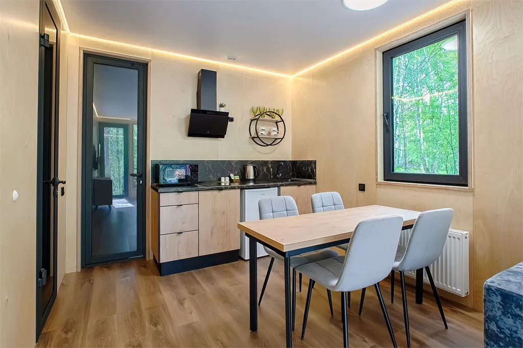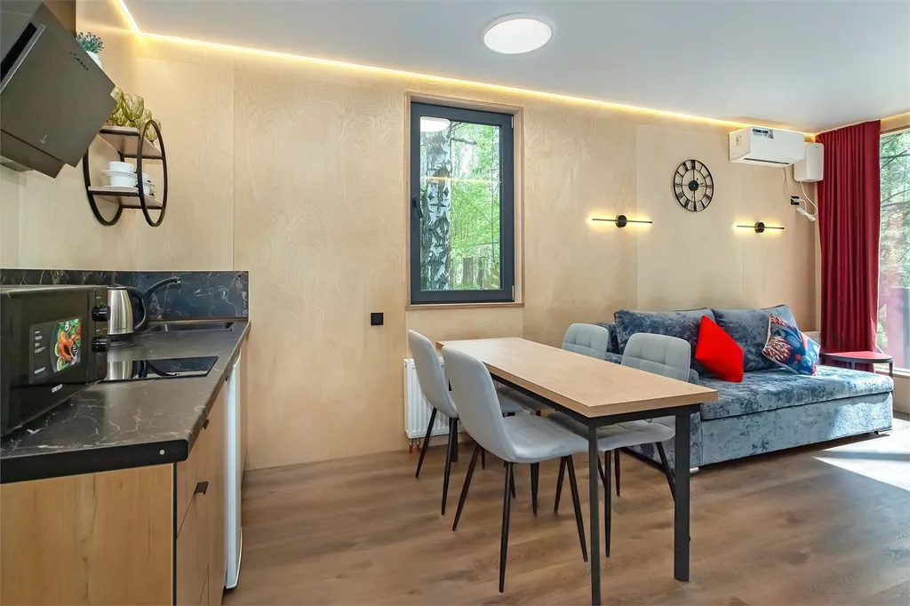Отдельно стоящий Домик со своей верандой и мангалом. Гостиная с кухонной зоной, с диваном и две спальни. Санузел с душевой кабиной.