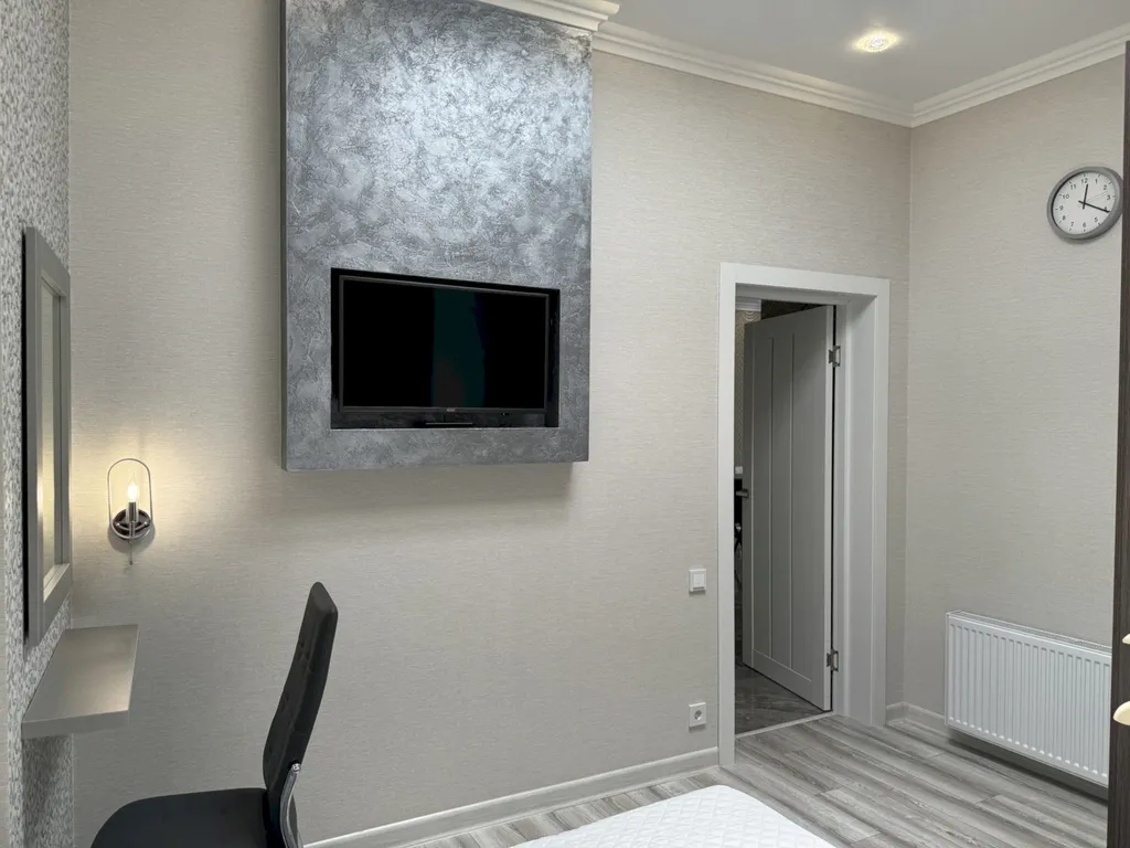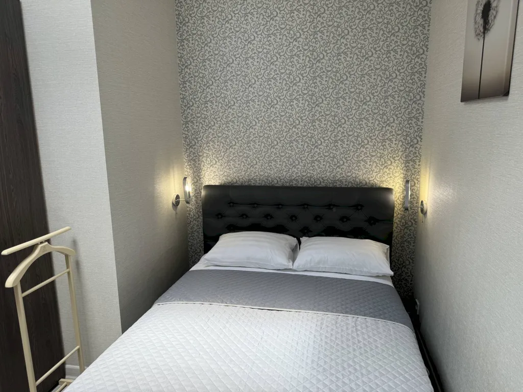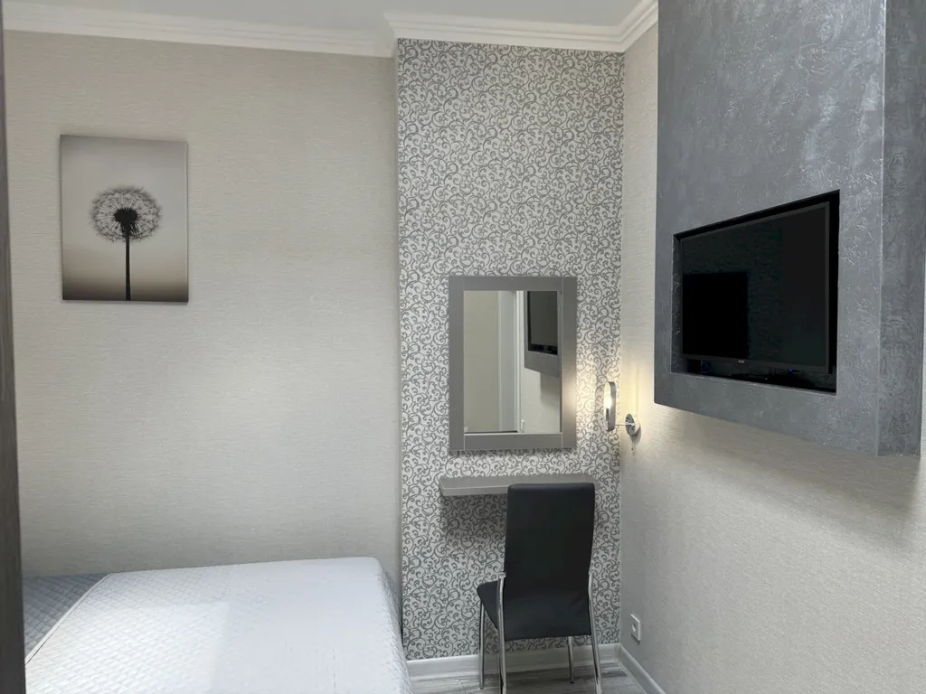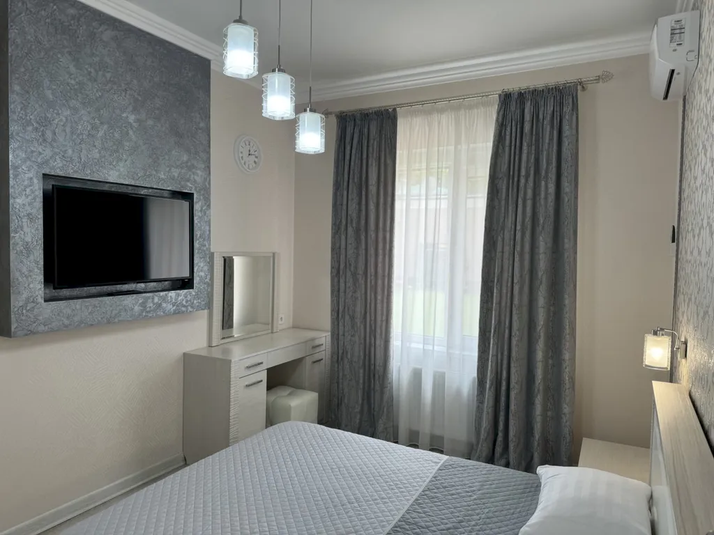 Двуспальная кровать 160 см, кондиционер, шкаф для одежды, ТВ, окна во двор.