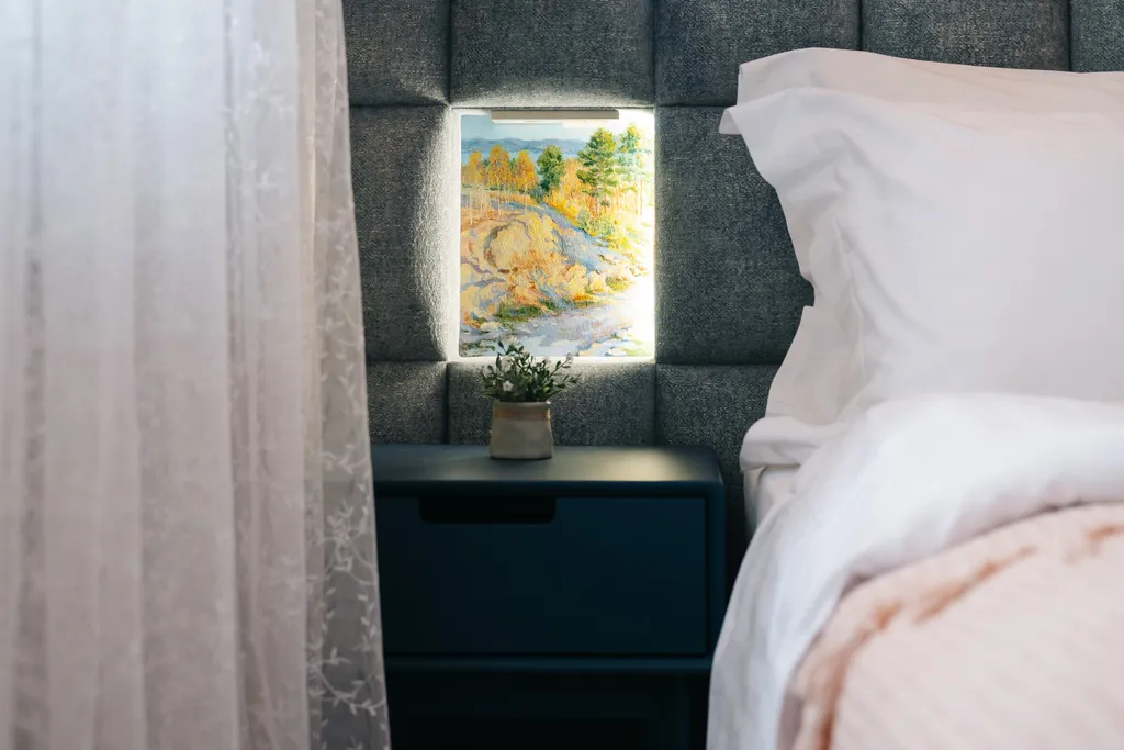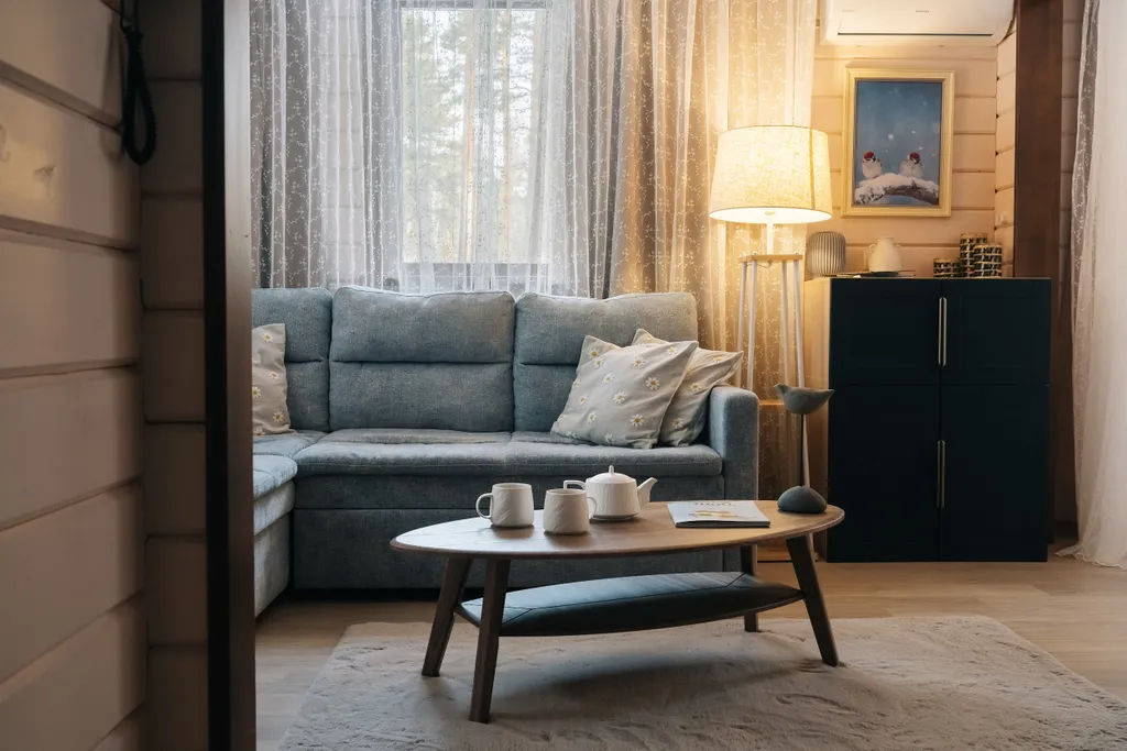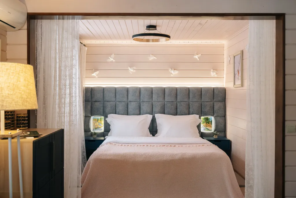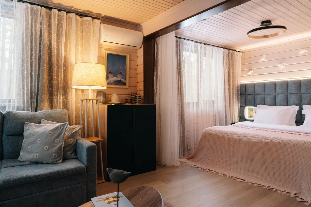 Двуспальная кровать, двуспальный диван, 2 прикроватные тумбы, журнальный столик, увлажнитель воздуха, телевизор Smart TV, Wi-Fi, гладильная станция, кондиционер, шкаф вещевой, шторы-блэкаут, зеркало, стремянка 2 ступени, торшер, телефон для внутренней связи, сейф