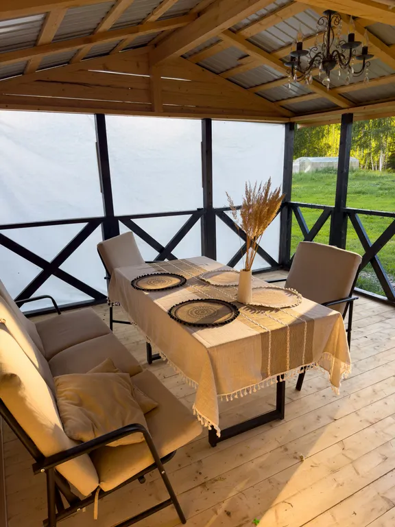 - Беседка на участке и зона отдыха под зонтом с вечерними фонариками