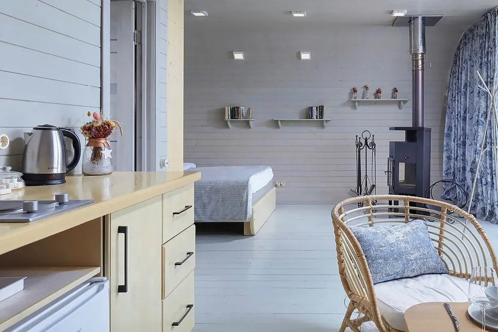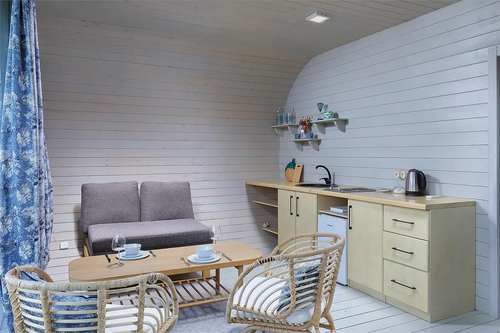 Самая большая из наших капсул. Единственный объект размещения с камином, кухней и полным набором посуды. Панорамное окно-стена с видом на Оку.