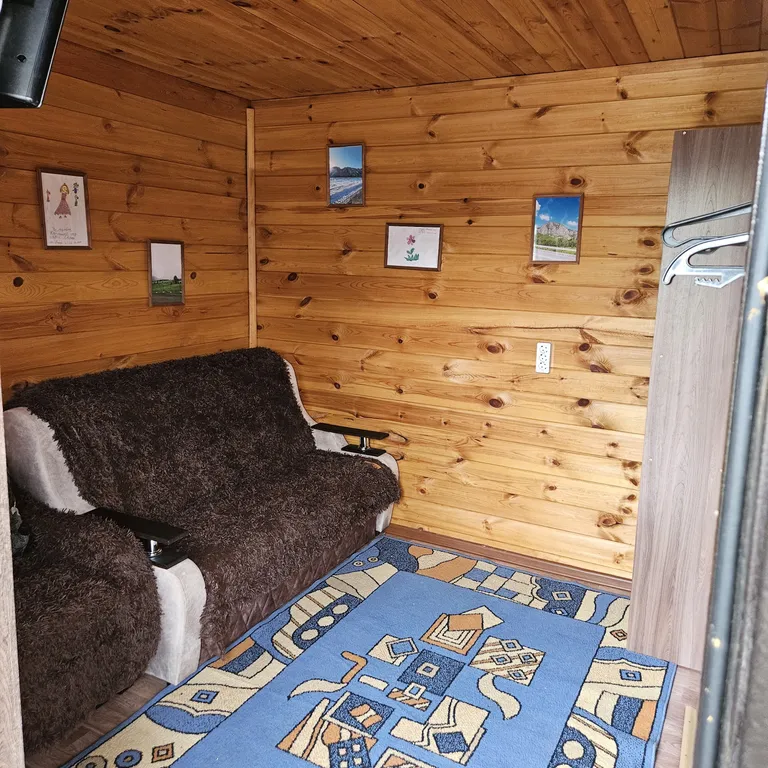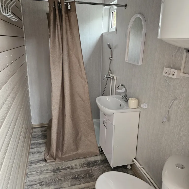 На 1-ом этаже дома расположены душ/туалет В гостиной раскладной диван 2 сп м., кресло- кровать, шкаф для одежды. Тв.