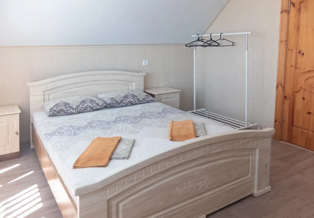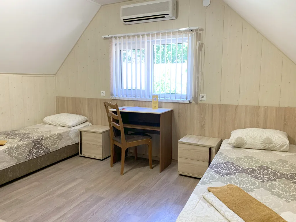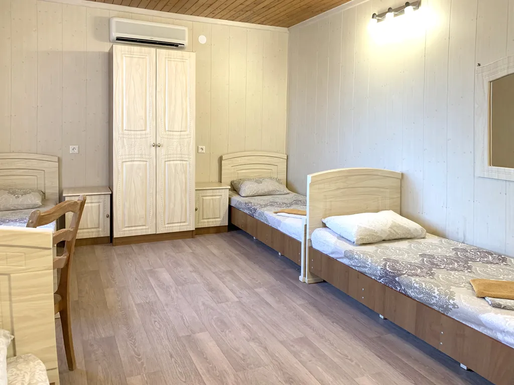 В коттедже - 2 номера с двуспальными кроватями, 2 номера с односпальными кроватями. Возможны дополнительные места для детей.