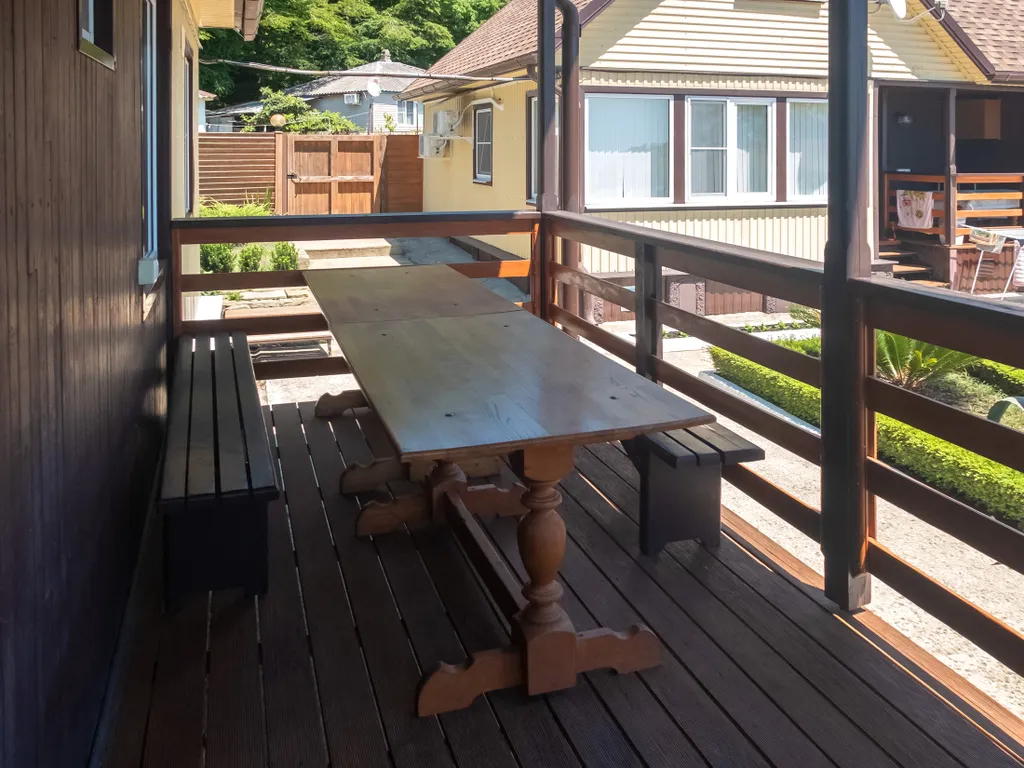 У коттеджа - отдельная веранда со столом и скамейками - вы можете ужинать или пить чай на свежем воздухе с видом на море!