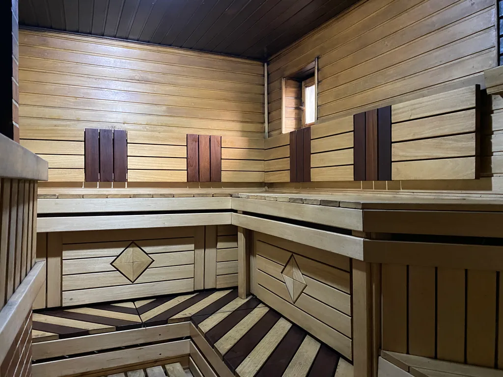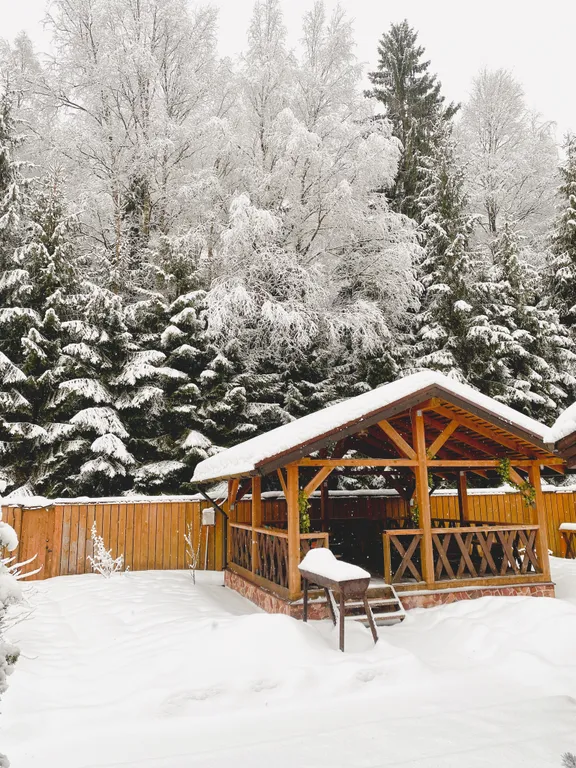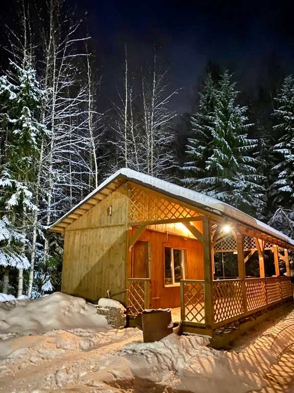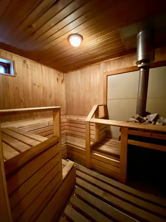 Финская баня — отдельный дом (в любое время года): комната отдыха с диваном и небольшой кухней, ТВ, парная, душ, туалет, веники возьми собой.