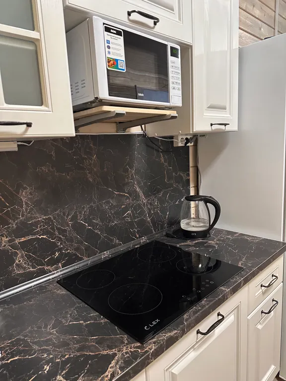 На кухне есть все необходимое: посуда и приборы, плита, холодильник с морозильной камерой, чайник, микроволновка.