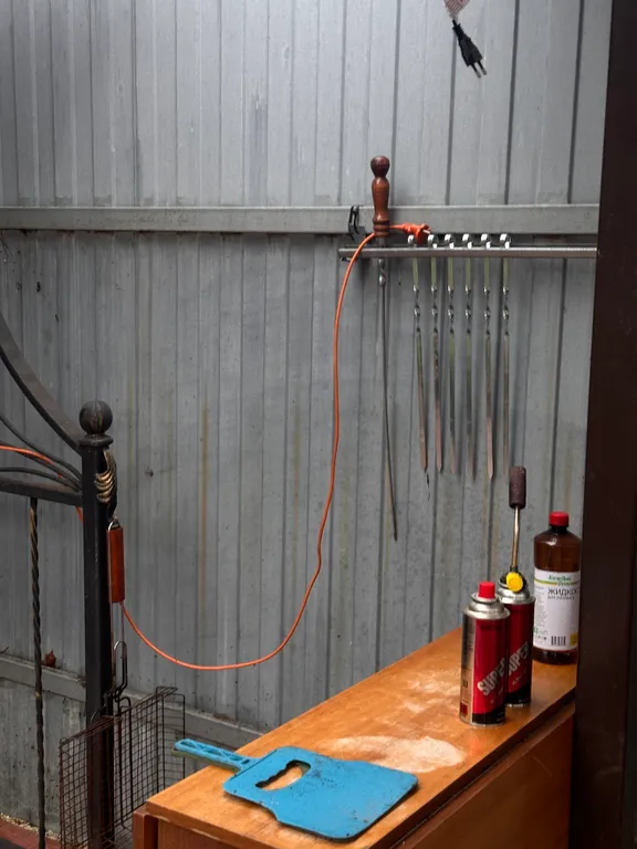 Во дворе есть уютная мангальная зона со всем необходимым: газовые горелки, дрова, шампура, решетка для приготовления вкуснейшего шашлыка.