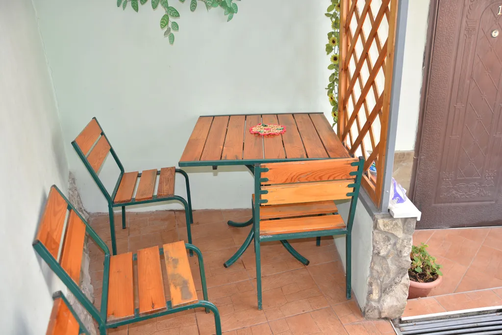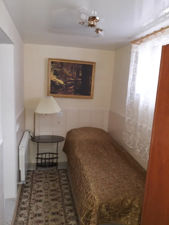 В домике имеются спальные места для троих человек, это раскладной диван-кровать, и в отдельной комнате одинарная кровать. Шкаф и пенал для одежды, прикроватная тумбочка и торшер, журнальный столик и два пуфика. В кухне не большой раскладной столик, кухонная мебель, три стульчика.