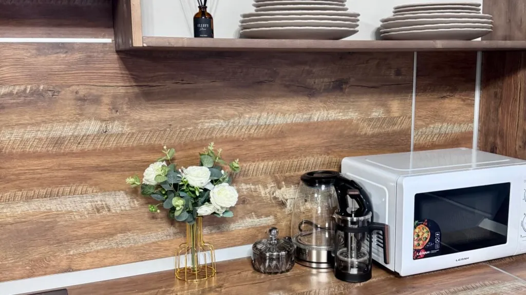Кухня - гостиная: кухонный гарнитур, чайник, холодильник, микроволновая печь, плита, посуда, стол, стулья, двуспальный диван, телевизор.