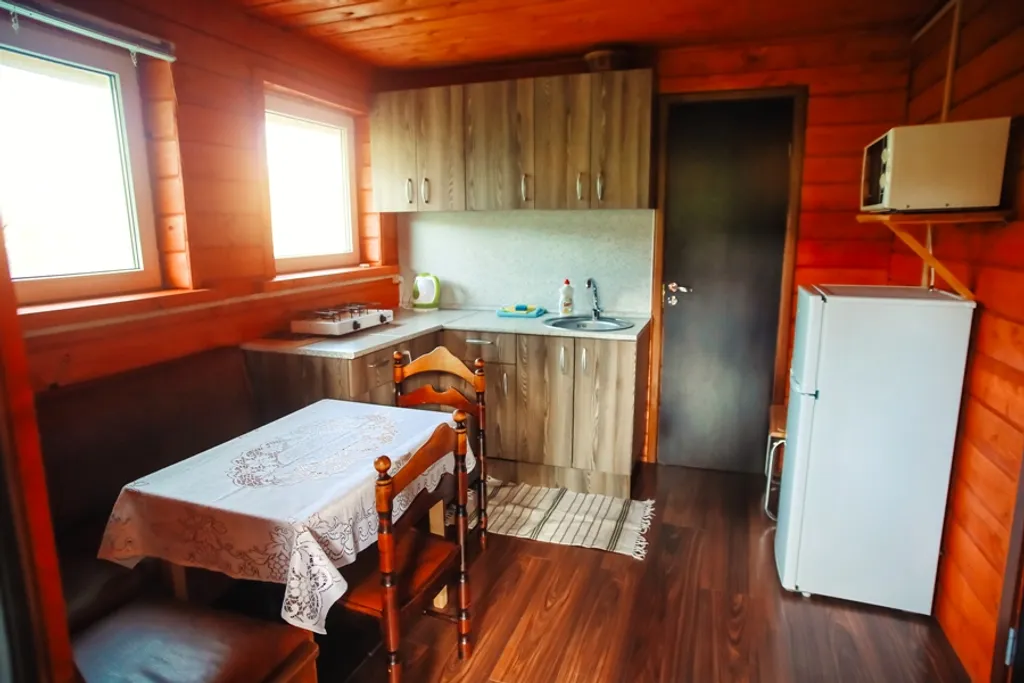 Кухня: чайник, микроволновая печка, газовая плитка, холодильник.