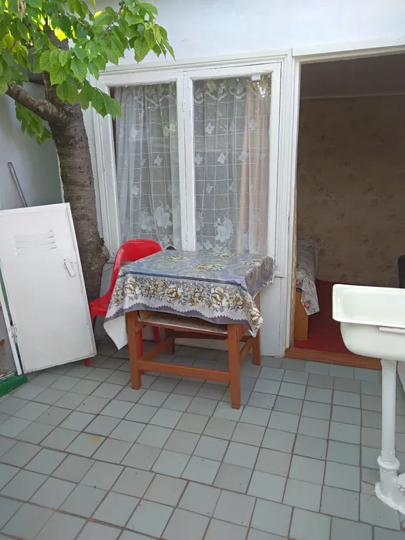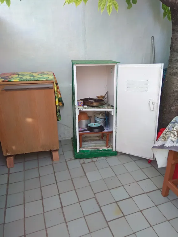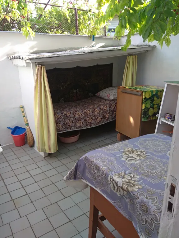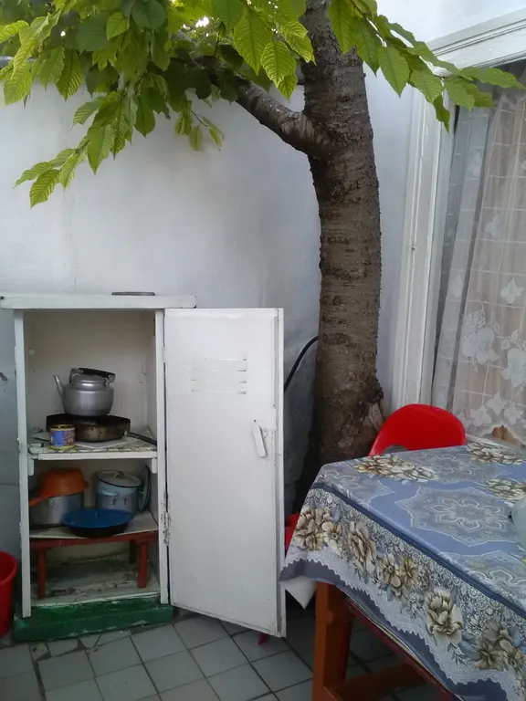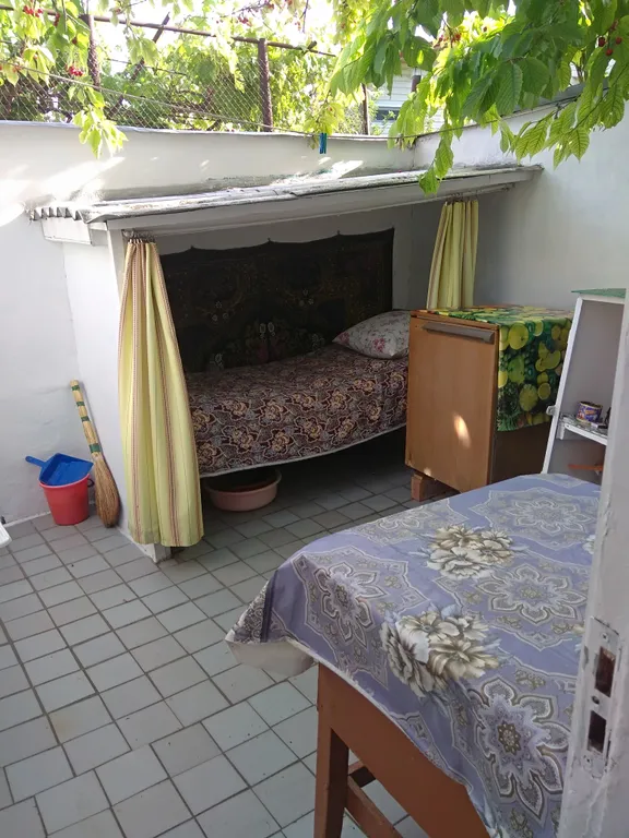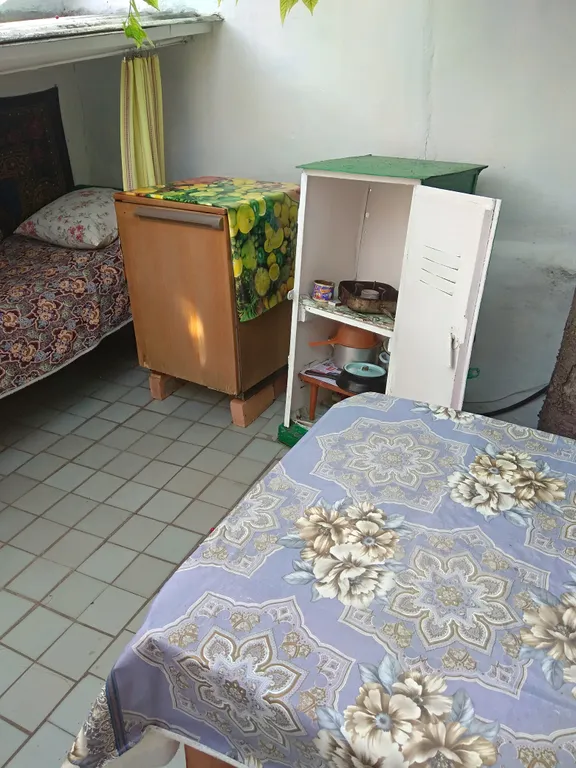 Кровать, шкаф, стол, газовый таганок, кровать для отдыха на улице.