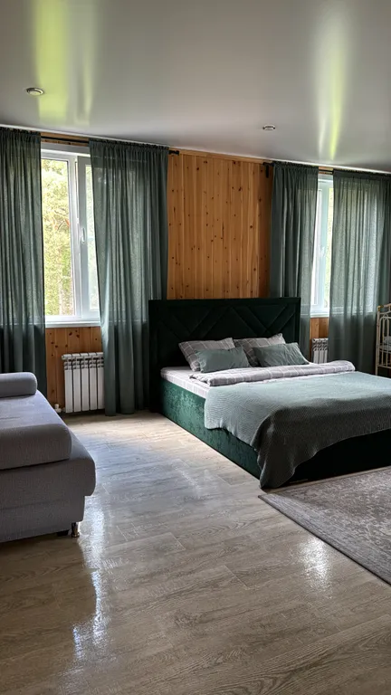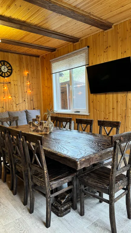 Двухэтажный коттедж оборудован для длительного проживания в любое время года, но также идеально подходят для проведения выходных в кругу семьи или дружной компании до 10 человек.