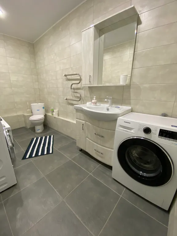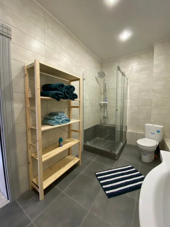 На каждом этаже сан узлы с душевой кабиной и ванной. Средства гигиены. Полотенце.