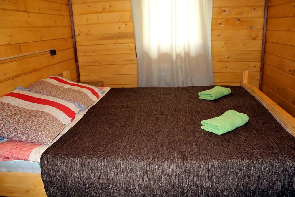 Домик на 4 человека. В доме две комнаты. В одной большая двуспальная кровать, во второй две односпальные кровати.