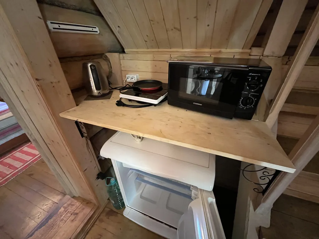 В номере: мини-кухня (холодильник, индукционная плитка, микроволновка, чайник, набор посуды).